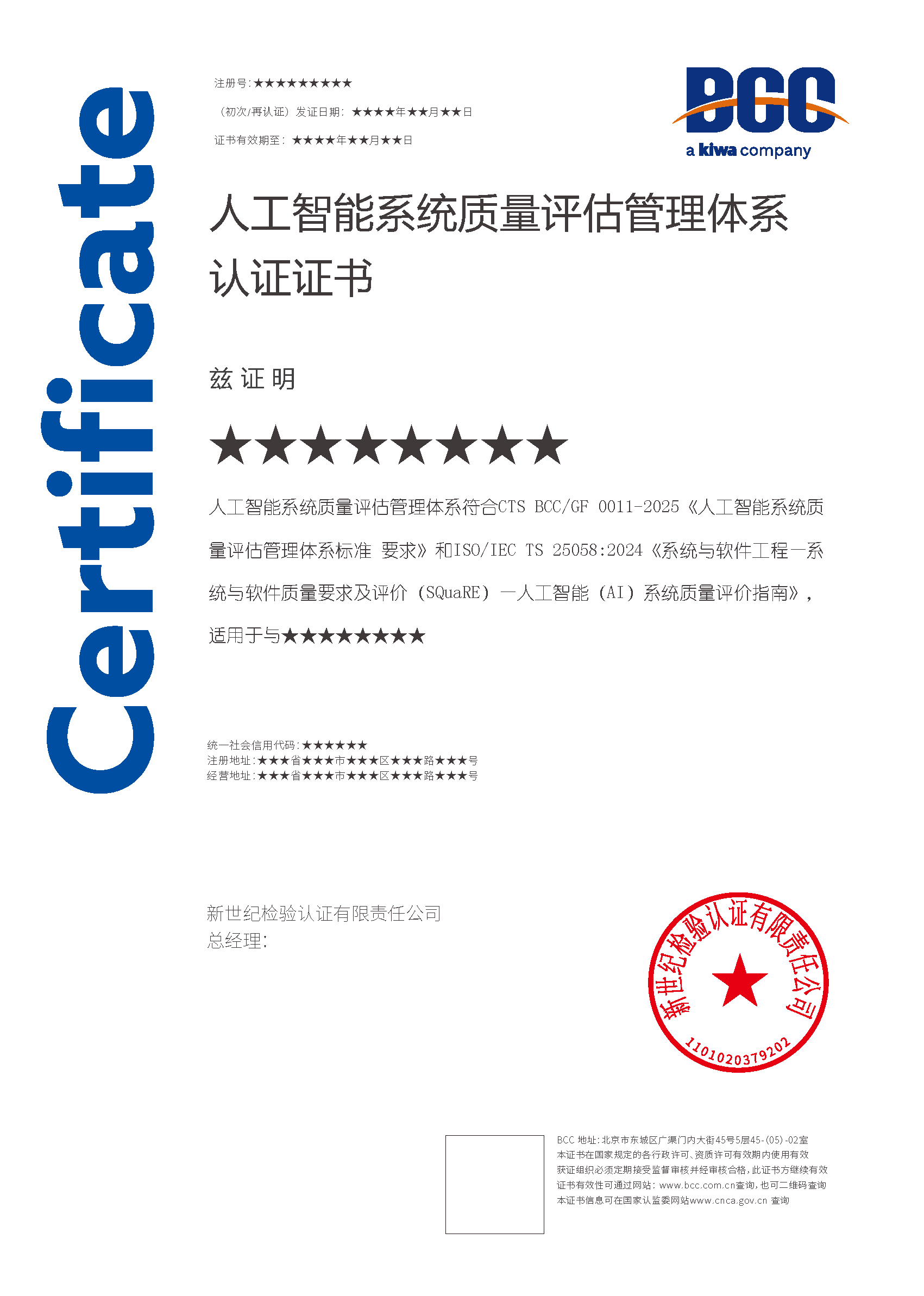 本頁涉及的認證服務中均有對應的《認證實施規(guī)則》,BCC擁有其最終解釋權。任何組織及個人未經(jīng)BCC許可,不得以任何形式全部或部分使用(法律要求除外)認證相關信息。如需獲取相關實施規(guī)則請用以下方式聯(lián)系獲?。弘娫挘?10-58579316 郵箱:fwjs@kiwa.cn