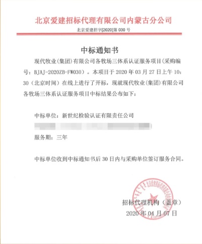 近日,新世紀(jì)檢驗(yàn)認(rèn)證有限責(zé)任公司(簡(jiǎn)稱 BCC)收到來自現(xiàn)代牧業(yè)(集團(tuán))有限公司的中標(biāo)通知,成為該公司總部及14家牧場(chǎng)質(zhì)量、環(huán)境、職業(yè)健康安全管理體系認(rèn)證項(xiàng)目的服務(wù)提供商。