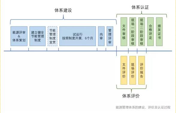 用能單位開展能源管理體系工作,通常包括:體系建設、認證或評價、持續(xù)運行和不斷提升的過程。