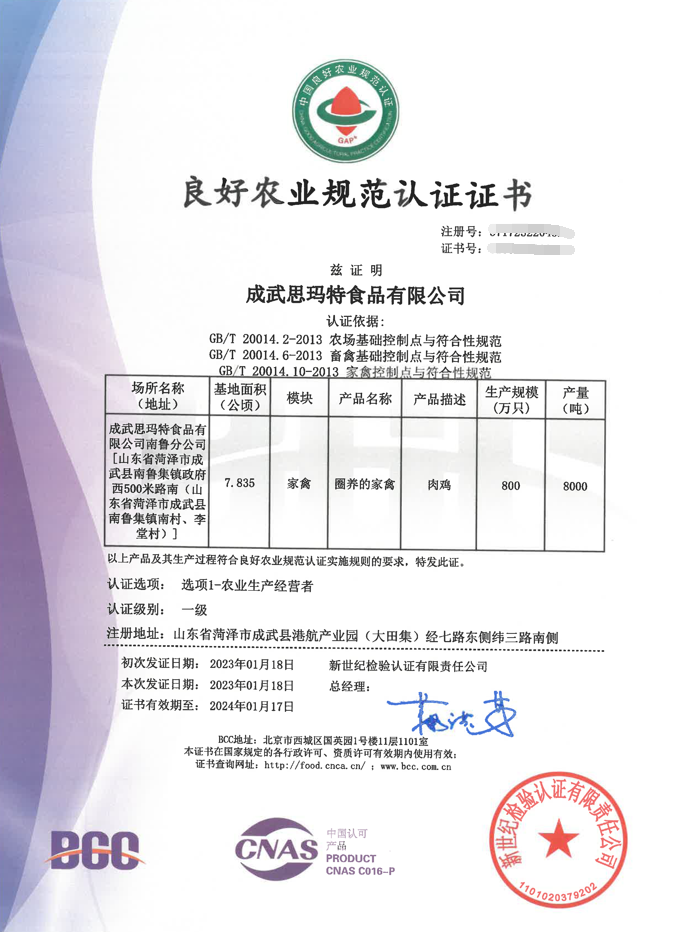 讓雞肉產(chǎn)品更具競爭力!成武思瑪特通過BCC實(shí)施的GAP(家禽模塊)認(rèn)證