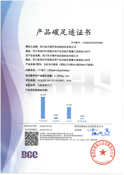 為響應國家政策、履行社會責任,四川省開璞環(huán)保包裝制品有限公司(以下簡稱:開璞環(huán)保)日前順利通過產(chǎn)品碳足跡核查,并獲得了BCC頒發(fā)的“產(chǎn)品碳足跡證書”。