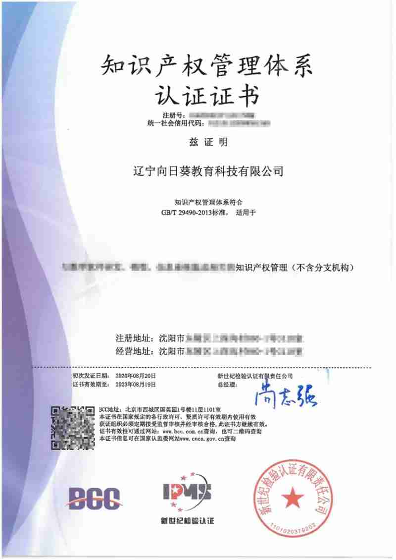 近日,向日葵教育科技順利通過知識(shí)產(chǎn)權(quán)管理體系認(rèn)證審核,喜獲由新世紀(jì)檢驗(yàn)認(rèn)證有限責(zé)任公司(簡稱BCC)頒發(fā)的知識(shí)產(chǎn)權(quán)管理體系認(rèn)證證書。
