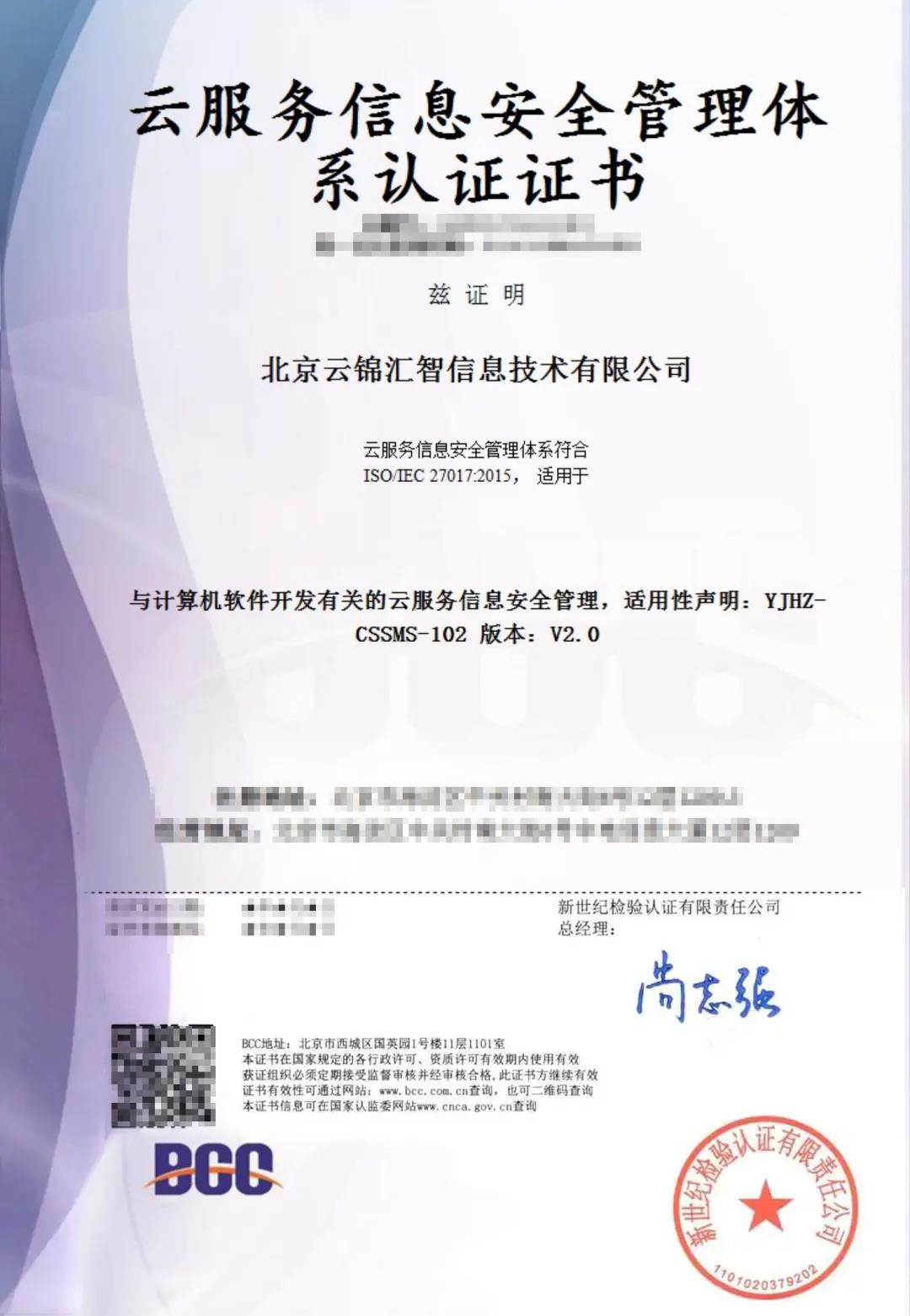 在云計算、云服務產(chǎn)業(yè)迅猛發(fā)展的大趨勢下,構建云安全生態(tài)圈,建立相對完善的安全防護機制,發(fā)揮行業(yè)資源與能力優(yōu)勢,承擔科技企業(yè)責任是云錦匯智的發(fā)展理念。ISO/IEC 27017認證證書的獲得標志著云錦匯智繼個人身份信息(PII)保護達到了全球一定的標準后,在云服務提供商中信息安全管理水平處于前列。BCC為企業(yè)提供信息安全,隱私安全解決方案,助力云服務提供商安全可持續(xù)發(fā)展。
