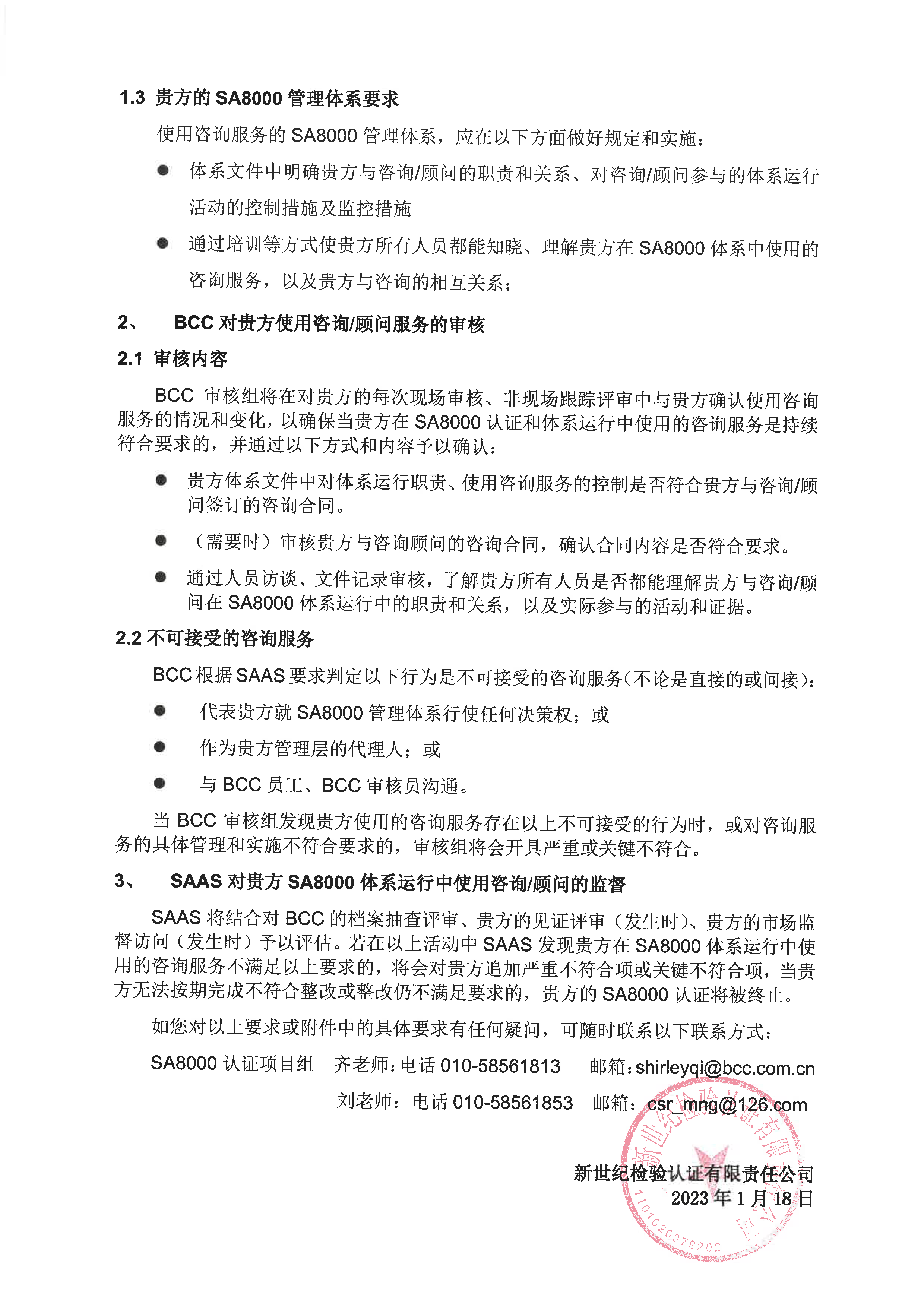SAAS將結(jié)合對BCC的檔案抽查評審、貴方的見證評審(發(fā)生時)、貴方的市場監(jiān)督訪問(發(fā)生時)予以評估。若在以上活動中SAAS發(fā)現(xiàn)貴方在SA8000體系運行中使用的咨詢服務不滿足以上要求的,將會對貴方追加嚴重不符合項或關(guān)鍵不符合項,當貴方無法按期完成不符合整改或整改仍不滿足要求的,貴方的SA8000認證將被終止。