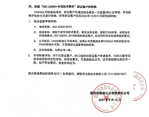 2021年7月1日(含)后通過認(rèn)證決定的,依據(jù)本告知書第四條款通過專項轉(zhuǎn)換評估后,經(jīng)評估符合要求的,頒發(fā)依據(jù)“ISO22000:2018”的認(rèn)證證書;經(jīng)評估不符合要求的,頒發(fā)BCC機構(gòu)證書;