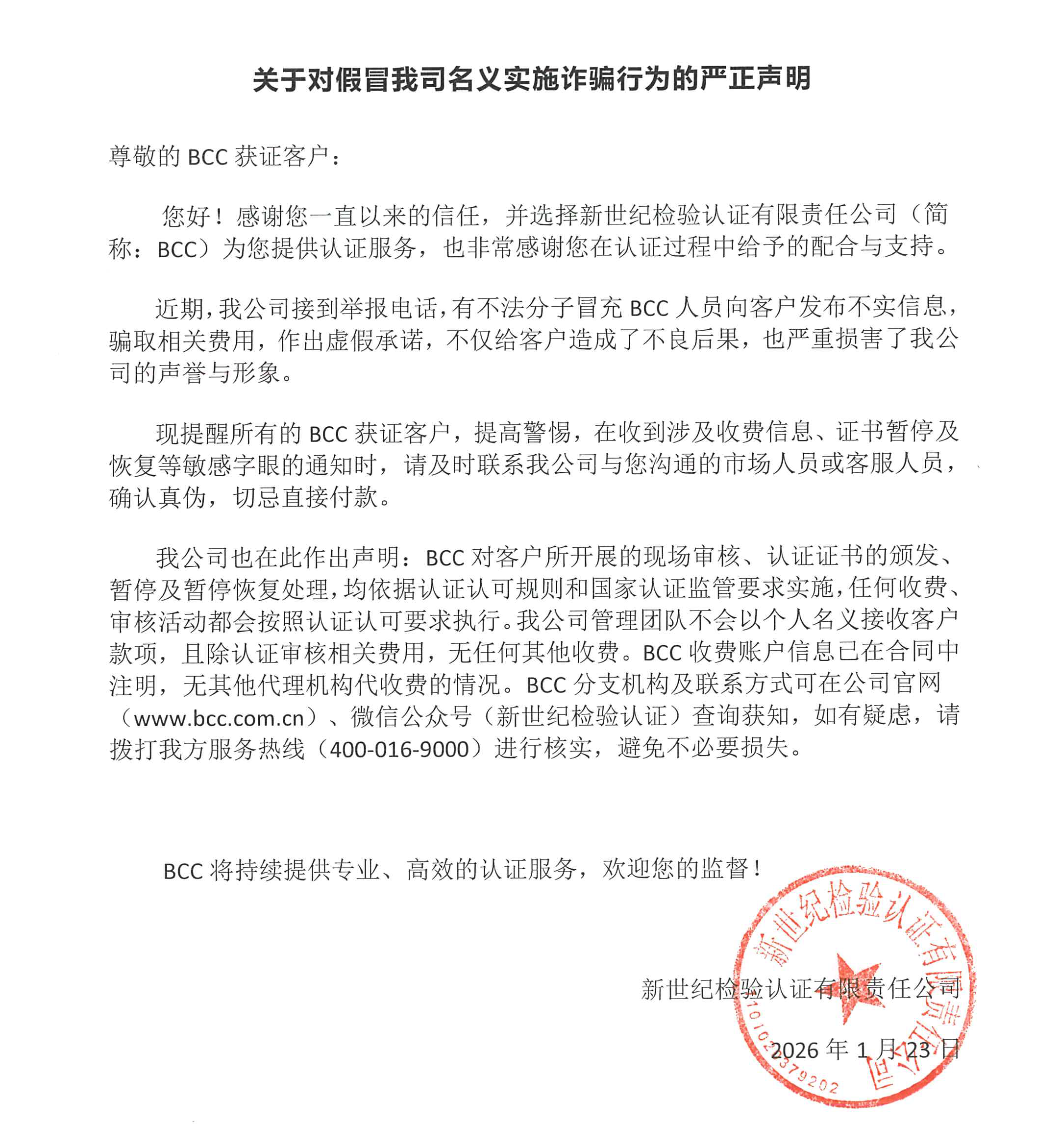 我公司也在此作出聲明:BCC對(duì)客戶所開展的現(xiàn)場審核、認(rèn)證證書的頒發(fā)、暫停及暫?;謴?fù)處理,均依據(jù)認(rèn)證認(rèn)可規(guī)則和國家認(rèn)證監(jiān)管要求實(shí)施,任何收費(fèi)、審核活動(dòng)都會(huì)按照認(rèn)證認(rèn)可要求執(zhí)行。我公司管理團(tuán)隊(duì)不會(huì)以個(gè)人名義接收客戶款項(xiàng),且除認(rèn)證審核相關(guān)費(fèi)用,無任何其他收費(fèi)。BCC收費(fèi)賬戶信息已在合同中注明,無其他代理機(jī)構(gòu)代收費(fèi)的情況。BCC分支機(jī)構(gòu)及聯(lián)系方式可在公司官網(wǎng)(www.jindingsrq.com)、微信公眾號(hào)(新世紀(jì)檢驗(yàn)認(rèn)證)查詢獲知,如有疑慮,請(qǐng)撥打我方服務(wù)熱線(400-016-9000)進(jìn)行核實(shí),避免不必要損失。