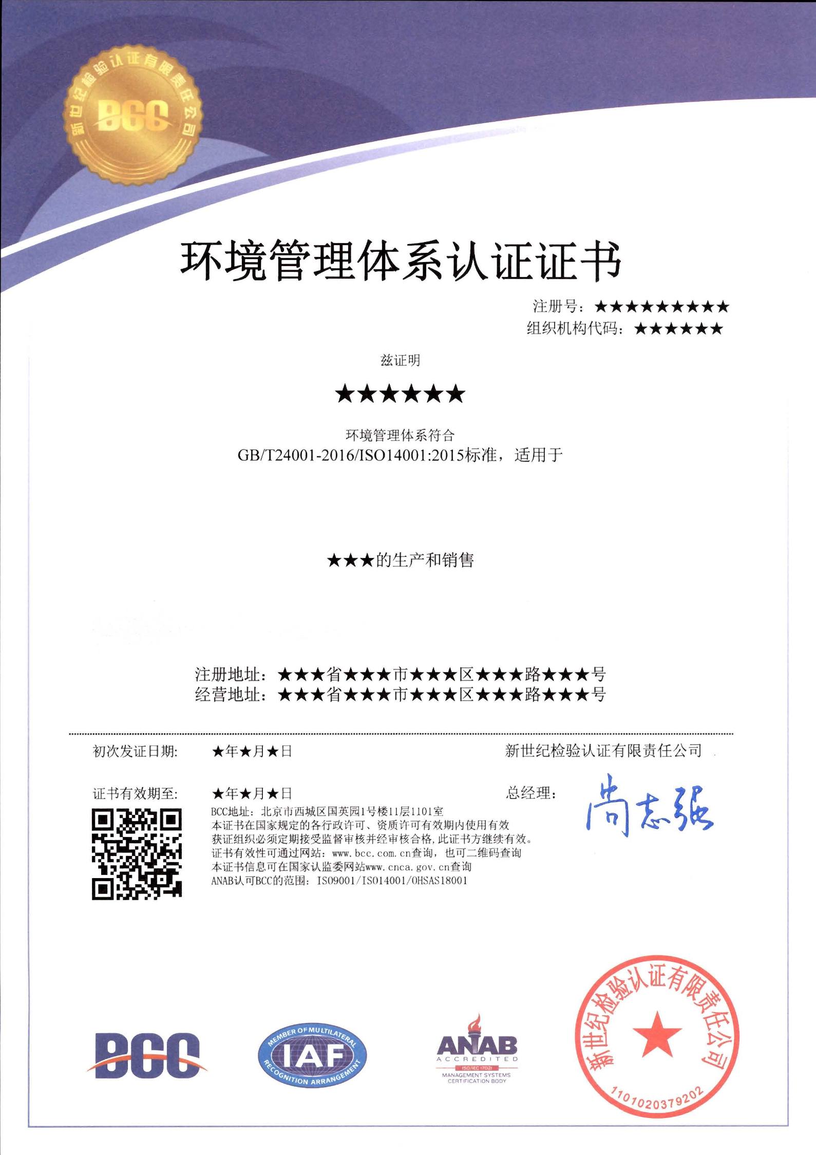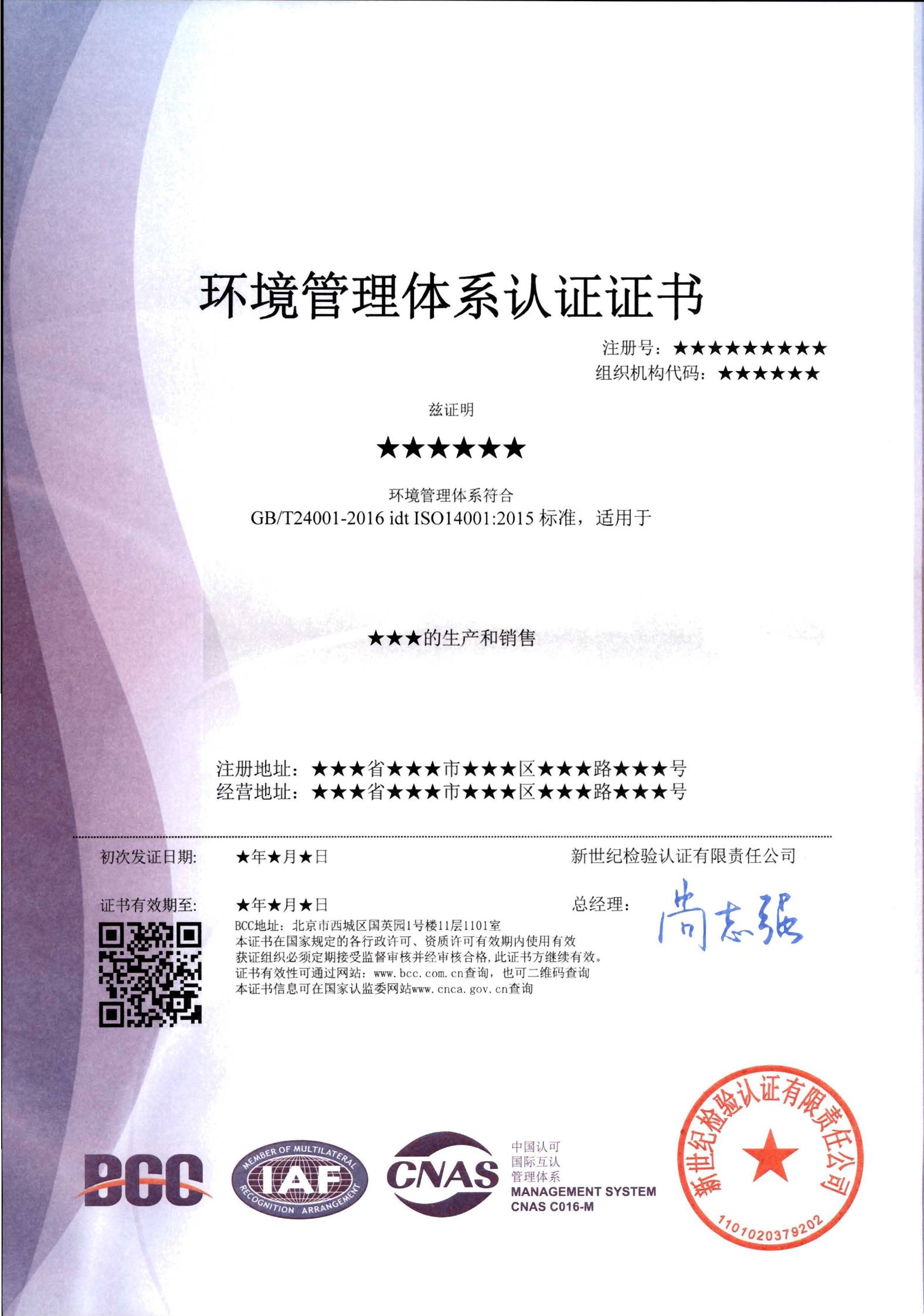 環(huán)境管理證書(CNAS+IAF)