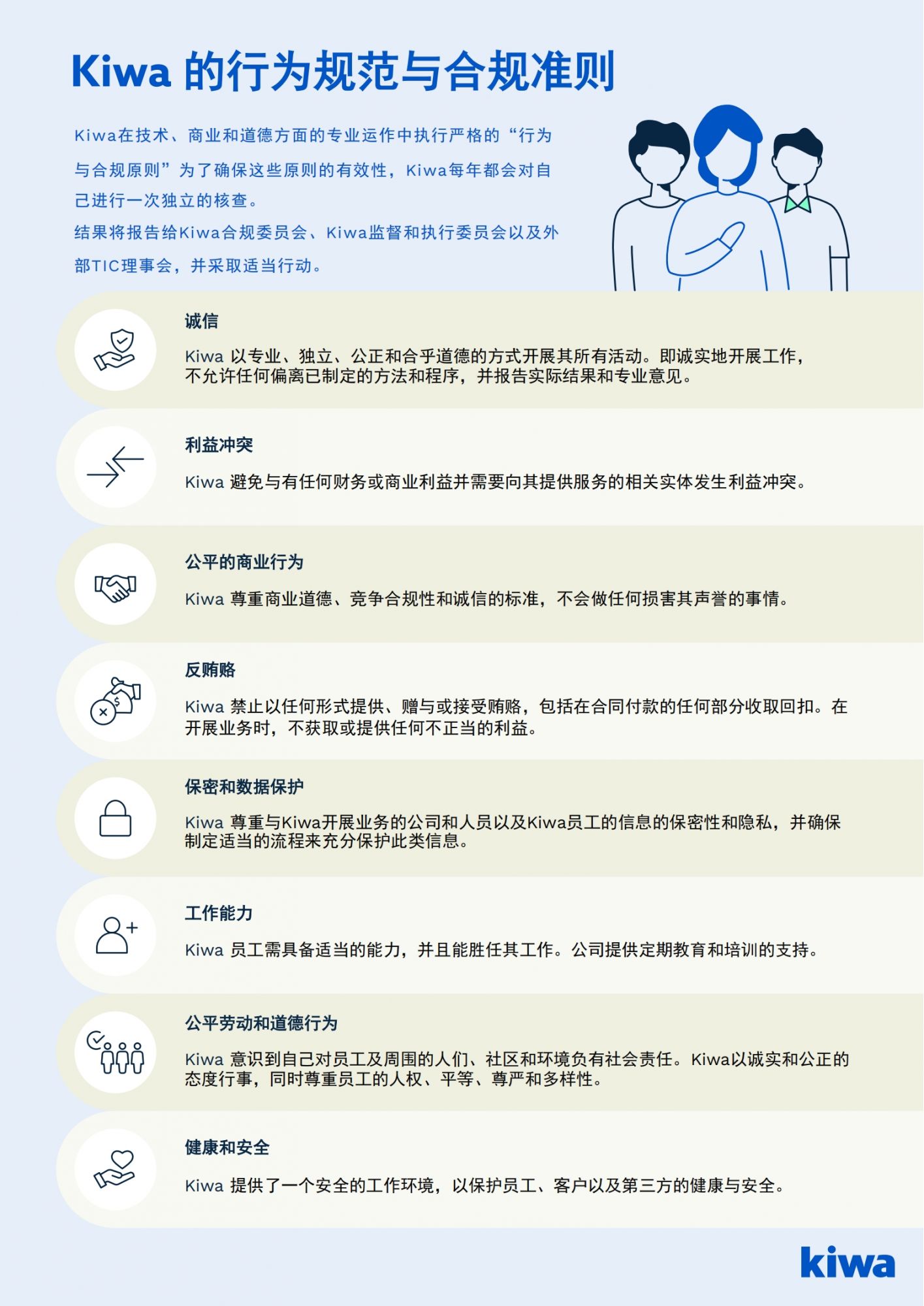 我們的行為準則與合規(guī)要求嚴格遵循 TIC 理事會合規(guī)框架的相關(guān)規(guī)定,Kiwa 作為該理事會的成員,始終積極參與其中。TIC 理事會是匯聚國際知名檢驗、檢測與認證機構(gòu)的全球性行業(yè)組織,致力于推動在安全、質(zhì)量、健康、倫理及可持續(xù)發(fā)展方面的最佳實踐與最高標準。